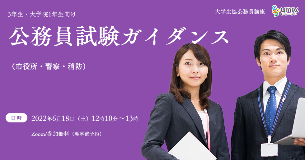 | 内容 | 公務員試験ガイダンス ※内容は予告なく変更になる場合がございます。 担当:全国大学生協公務員講座事務局 |