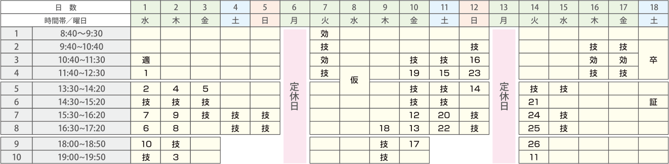毎日通学でき、教習期間を優先にお考えの方は教習所の作成した「教習スケジュール」に沿って教習を行い通学制で最も早く卒業することも可能です。教習期間中は、ほぽ毎日6~8時限のスケジュール教習となります。